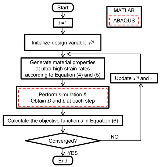 Flow chart of the optimization process for the calibration of hardening behavior at ultra-high strain-rate region. (Adapted from ref. [6]).