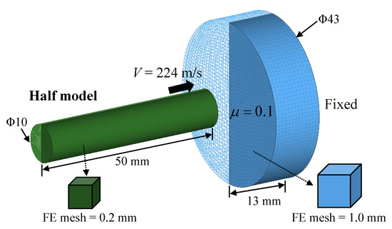 Finite element mesh system and simulation conditions in the calibration of hardening behavior at ultra-high strain-rate region.