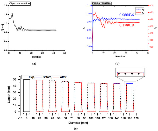 Optimization results for the calibration of hardening behavior at ultra-high strain-rate region: (a) Convergence of the objective function; (b) Convergence of design variables; (c) Deformation image series before and after calibration with experimental points.