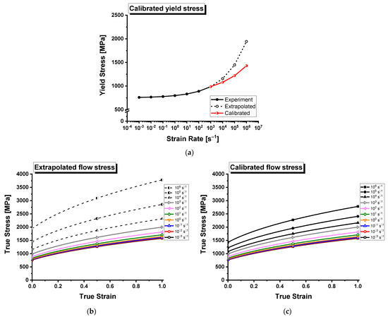 Calibrated yield stress and flow stress at ultra-high strain-rate region: (a) Yield stress before and after calibration; (b) Flow stress before calibration; (c) Flow stress after calibration.