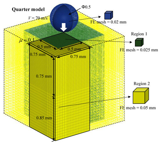 Shot peening is a method to improve surface hardness and fatigue life by inducing compressive residual stress on the material surface, phase transformation from austenite to martensite, and finer grain sizes. In this process, a large number of shots of very small and hard ball-type particles collide to a peen of the surface of the target material with a high impact velocity. This collision induces high strain rate deformation and gradient of plastic deformation which leads to residual stress. Thus, the obtained material properties of the AISI 304 steel considering the strain rate effect are applied to a shot peening simulation and this result is compared with that considering the quasi-static state material properties only. This paper adopts a single shot impingement at the center of the surface and extracts the residual stress profile along the depth direction at the center of the material. Figure 12 shows the finite element model and analysis conditions. A single shot, in which elastic deformation is considered only, impacts the center of the peen at a velocity of 70 m/s. To save computing time, a quarter model is used where symmetric conditions are applied in the x-direction and y-direction. In order to remove stress oscillation, Rayleigh damping coefficients of and are applied to coarse mesh region 2 and the values are referred from [29,30]. The element type C3D8R is adopted for all elements and the element sizes are 0.025 mm in the inner part of the peen region 1 and 0.05 mm in the outer part of the peen region 2. The finite element mesh system consists of the total number of nodes of 36,912 and the total number of elements of 33,175. Elastic material properties used in this simulation to the shot and peen are the same as those in Table 1. Finite element simulation is performed with the commercial software of ABAQUS/Explicit. Figure 13a,c show residual stress distribution contours of with deformation shapes for both cases and the profile of the residual stress along with the depth at the center of the peen. These figures show similar tendencies in stress distribution but difference in magnitude. The maximum compressive residual stress with dynamic material properties is 1.32 times higher than that with the quasi-static properties case. The reason of the difference can be explained as the increase in the flow stress with the increase in the strain rates. When a shot collides the surface of the AISI 304, the material undergoes deformation at high strain rates and the flow stress increases abruptly due to high-speed plastic deformation. As a result, the residual stress increases even for a smaller deformation amount due to high strain rate deformation. This result implies that simulation of high-speed deformation such as shot peening needs to adopt flow stress curves with the strain rate effect for accurate analysis results especially when high strain rate deformation is expected. In addition, it should be taken for granted that the dynamic material properties are necessary in this kind of simulation because the strain rate reaches up to ultra-high strain-rate region as demonstrated in Figure 13b in shot peening simulation.