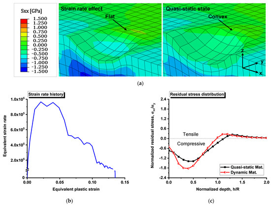 Finite element analysis results of shot peening simulation with the flow stress of the quasi-static state and considering strain rate effect: (a) Residual stress distribution contours and deformation shapes; (b) Strain rate history underneath the center; (c) Residual stress profiles along with the depth at the center.
