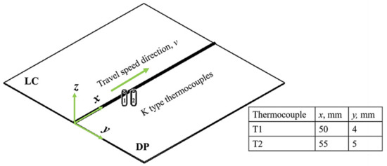 By means of K type thermocouples, weld thermal cycles in the HAZ were determined. These sensors were placed in direct contact with the top surface of the DP steel sheet at a distance of 4 and 5 mm from the center of the joint preparation. Figure 2 shows the location of the thermocouples. A National Instruments board NI 9213 with sampling rate of 100 Hz was used to collect the signal temperature using a LabVIEW program.
