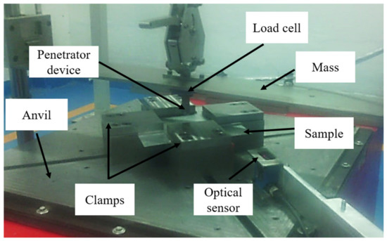 Regarding the impact tests, samples of 200 mm × 200 mm were cut to conduct free-fall impact tests. Figure 4 shows the experimental arrangement where the tower elements are indicated. Initial conditions for the impact test were: mass 14 kg, elevation 1 m, potential energy 137.34 J, impact kinetics energy 137.34 J, and impact speed 4.429 ms−1.