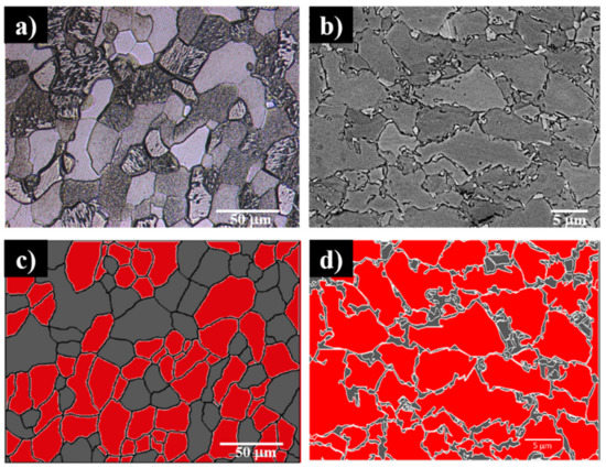 Real microstructures (Figure 5a,b) were traced using polyline command in the AutoCAD software to obtain a well-defined grain boundary image that would quantify the number of grains present. The identification of phases was carried out by visual inspection and by means of manual processing: a specific color was assigned to each phase in the SigmaScan Pro5 software, maintaining the space relationship in the image through its equivalent in pixels. The number of total grains of each phase, there area, and the area of average grain size was determined through SigmaScan Pro5 software. Figure 5c,d shows the micrographs worked in the AutoCAD software, and each of the phases that compose them are indicated in a different color. For both cases, the red color identifies the ferrite, and the dark gray color is used to identify the perlite in the LC steel and the martensite in the DP steel.