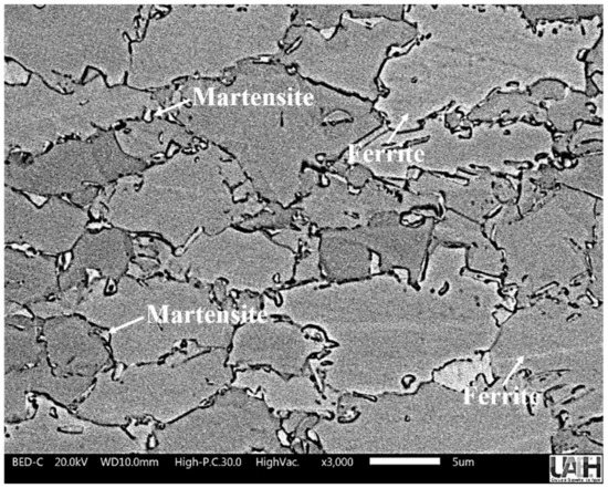 Figure 7 shows the microstructure of the DP steel. It can be seen that it has a ferrite phase matrix that provides ductility, and martensite phase islands that provides an increase in the mechanical strength. A minimum quantity of retained austenite has been reported in this steel [23]. However, it is not possible to observe it by means of microscopy. Table 2 shows the phases percentage in DP steel, ferrite grain size equivalent according to ASTM E112 is G12.5. Martensite has not equivalent grain size number, due to is very small size.