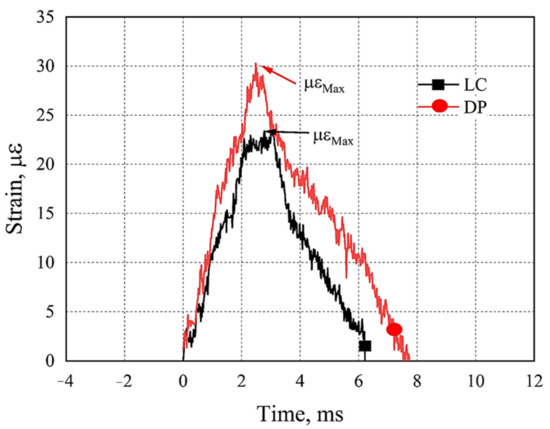 During the impact, the energy supplied was not enough to fracture the material and the welding. Figure 8 shows the strain vs. time behavior obtained from the LC and DP impact test. It can be seen that a maximum strain (23.3 µɛ) is generated at 3.04 ms in LC steel, and DP steel presents the highest strain (30. 3 µɛ) at 2.48 ms.