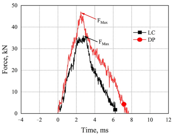 Figure 9 shows the force vs. time behavior for LC and DP steels, which has a maximum force (Fmax) of 36.02 kN at 2.8 ms and 47 kN at 2.5 ms, respectively. As can be seen, DP steel has a better impact behavior in terms of the supported reaction force. This is attributed to the combination of ductile phase (ferrite) and hard phase (martensite).