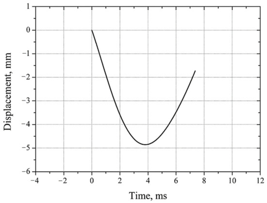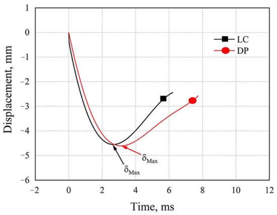 Figure 10 shows the displacement-time curve of the LC steel, where a maximum displacement (δ) of 4.5 mm is observed at 2.66 ms. In addition, for DP steel, the highest displacement was (δ) 4.6 mm at 3.2 ms; after this time, the material began to recover elastically.