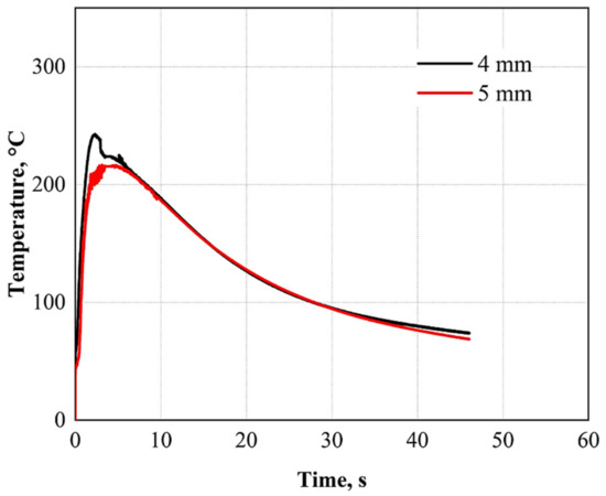 Finally, at ~4 mm the microhardness stabilizes, indicating the end of the HAZ, at approximately 242 °C according to Figure 11, i.e., there are no microstructural changes. This is attributed to the fact that the peak temperature is far below Ac1 (~720 °C), and the d-well time is short.