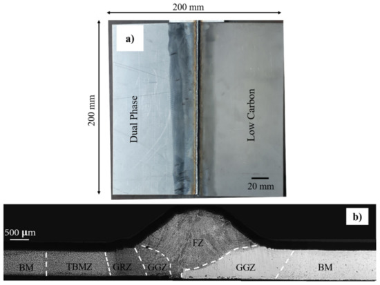 The evolution of lightweight cars is a factor that has driven the development of new types of steels over the last decades. Advanced High Strength Steels (AHSS) [5,6] are the preferred steels used by automotive companies as they have a good stress-strain ratio. They are used in the automotive industry for structural parts, side panels, side members, and impact bars, in general, at specific points that can provide safety to passengers in the event of an impact [7]. In specific, the dual phase (DP) [8,9] families are some of the preferred steels used by automotive companies. These steels have characteristics that bring considerable advantages, such as good performance in collisions. It is important to note that the lightness of the vehicle leads to a decrease in fuel consumption, which is a strategy adopted by the automotive industry to reduce polluting emissions into the environment. In an automobile structure, the DP steels are be joined with AHSS and other types of steels with different thickness, such as the low carbon (LC) steel families, since LC steel can constitute 50 to 60% of the weight’s vehicle. The joints with dissimilar materials and thickness are indispensable, especially in safety issues related to new cars that will compete in the automotive business.