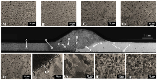 Microstructural changes generated by the welding process in dissimilar weld LC–DP: (A) TBMZ; (B) GRZ; (C) DP GGZ; (D) DP GGZ–FZ interface; (E) FZ; (F) LC GGZ–FZ interface; (G) LC GGZ; (H,I) LC BM.