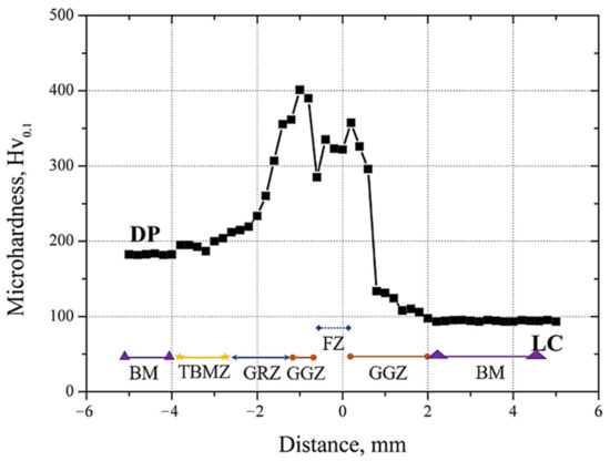 Regarding DP steel, the greatest hardness of the welded joint is found in the GGZ (401 HV0.1). As can be seen in Figure 13D, this area has the highest presence of the hardened martensite phase. This due to the high temperatures reached, followed by the uncontrolled tempering that takes place. Regarding the GRZ in DP steel, a slight increase in hardness can be noted, which is attributed to grain refinement, and the martensite formed during the fast cooling. At approximately 3 mm (inside the TBMZ), there is a slight drop in hardness, an area that some authors have called a subcritical zone. However, here, it cannot be defined as such.
