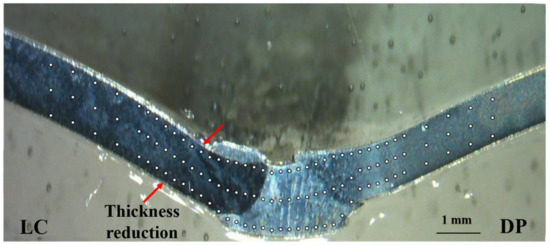 - During the impact test, a thickness reduction in the low carbon heat affect zone was generated; however, the dissimilar welding was not fractured. The absorbed energy was 19.3 J for the low carbon steel, while for the dissimilar joint, it was (50.2 J), slightly lower than for DP steel (50.7 J). Nevertheless, it presents a better performance than LC steel.