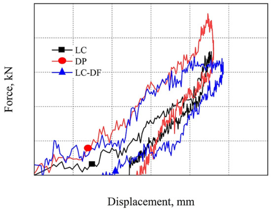 Force–displacement assessment during the impact test on LC, DP, and LC–DP welding.