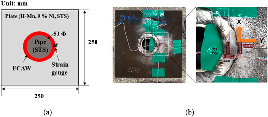 The materials used in the experimental examination were conventional cryogenic steels, i.e., 9% Ni steel, STS, and high-manganese austenitic steel, and they were welded with an STS pipe. Table 1 and Table 2 present the chemical compositions and mechanical properties of each type of steel. Figure 1 shows the shape of the specimen and the groove shape. The dimensions of the plate used were 250 mm × 250 mm × 20 mm (length × width × thickness). The groove was K-shaped with an angle of 45° on both sides. Moreover, the pipe thickness was 3 mm, and the diameter was 50 mm. The welded joints were subjected to multi-layer flux-cored arc welding (FCAW) with a K-groove (Figure 1b), which is a welding process widely used in LNG storage tank construction. The top of the plate was welded, and the bottom was welded with the same procedure. The inter-pass temperature was 110 °C.
