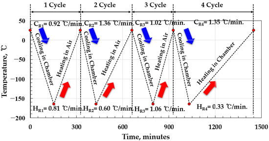 A total of four cycles were performed, and the heat and cooling rates in each process are indicated in Figure 3. The cooling and heating rates were not specified before the experiment, and the experiments were conducted under similar environmental conditions. The cooling and heating rates were similar, as shown in Figure 3. The cooling rate (CR) was 0.92–1.35 °C/min, and the heating rate (HR) was 0.33–1.06 °C/min. The experiment was started at room temperature; the temperature was subsequently reduced to −165 °C and then increased to room temperature in air. This process was repeated four times.
