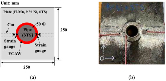 There are several methods for measuring the welding residual stresses in weld joints. The experimental methods include destructive and nondestructive methods. A destructive method was used in this study to measure the welding residual stress because destructive methods are the most widely used and accurate methods. Destructive methods include the hole-drilling method, cutting method, and X-ray method, and the cutting method was used in this experiment because it is the most reliable destructive method. Figure 4 shows the position of welding residual stress measurement using a two-axis strain gauge. The welding residual stress was measured in the fusion line of the pipe and plate because the strength mismatch area was the worst position in the bond line. In addition, the strain gauge was attached to a symmetric position to ensure the reliability of the measured residual stress value. The specifications of the strain gauges are presented in Table 6. FCA-1 is a two-axis strain gauge for cryogenic temperature conditions. The gauge length, width, face dimension, and resistance were 1 mm, 0.7 mm, 4.5 Φ, and 120 Ω, respectively. The welding residual stress was measured using the cutting method with the plate and pipe of the weld joints. When measuring the welding residual stress via the cutting method, it was necessary to control the heat generated by setting the cutting speed. Therefore, the cutting speed was maintained at 2 mm/min, and the heat generated during cutting was controlled using oil and water. To completely remove the welding residual stress distributed in the weld zone, cutting was performed along the longitudinal, width, and thickness directions. Finally, after cutting in all the directions, the strain was measured, and the initial welding residual stress was calculated using Hooke’s law.