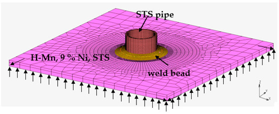 The LNG storage tank should be maintained at a cryogenic temperature (−165 °C) for natural-gas liquefaction [17]. The materials used to manufacture LNG inner tanks are regulated by the Maritime Safety Committee (MSC) [18,19]. In the case of cryogenic steel used in conventional LNG storage tanks, the LNG storage tank and STS pipe are connected for LNG cargo handling [20,21,22,23,24]. When the LNG storage tank is manufactured, most STS pipes are connected to it with dissimilar welding. The dissimilar joint has complex stress distribution because of the differences in mechanical behavior due to the difference in the thermal coefficients of the two steels.