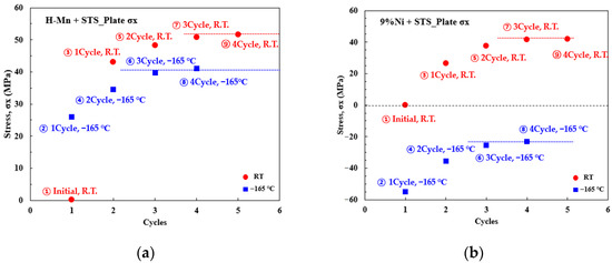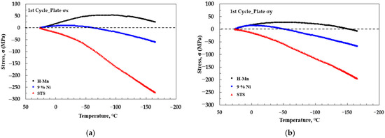 Figure 6 shows the stress behaviors of σx and σy for the three types of cryogenic steels. The loading–unloading test was performed four times at room temperature and –165 °C, and the results of one test cycle are presented in Figure 7. The graph shows the process of stress generation with respect to the temperature.