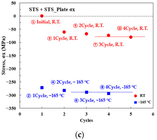 Figure 7. Stress values at each cycle for (a) high-manganese austenitic steel, (b) 9% Ni steel, and (c) STS at room temperature and −165 °C in the experiment.