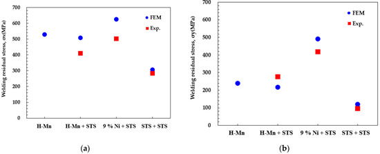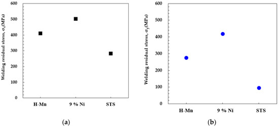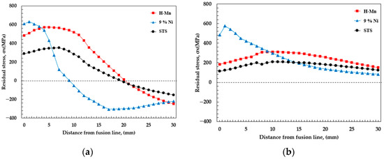 Figure 8. Welding residual stresses in the (a) weld line direction, i.e., σx, and (b) transverse direction, i.e., σy, for high-manganese austenitic steels, 9% Ni steel, and STS specimens prepared via the cutting method.