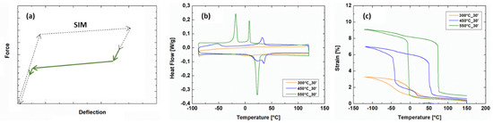 (a) Schematic representation of the flag-shaped pseudoelastic response, where the green line is the unloading path exploited in biomedical applications. (b) Effect of annealing temperature on the phase transformation temperatures of a body-temperature NiTi wire determined with differential scanning calorimetry (at 10 °C/min in the range −90–120 °C). (c) Effect of annealing temperature on the strain-recovery response of a body-temperature NiTi wire (under a constant load of 150 MPa, at 5 °C/min in the range −120–150 °C). Each heat treatment was done for 30 min and followed by a water quench [13].