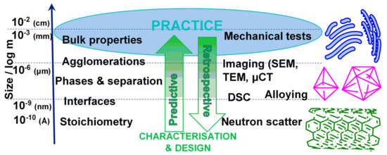 Schematic of structure-property-performance correlation, accessible through a combination of conventional and novel techniques encompassing nano- through meso- to macro-length scales of each parameter studied for general materials science and engineering.