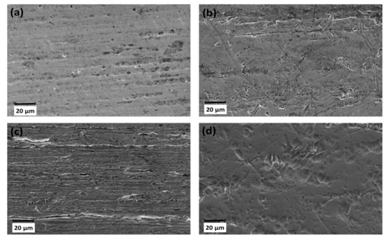 Representative SEM micrographs at 2000× magnification of (a) NiTi_Vis Plus, (b) NiTi_Azdent, (c) β-Ti_Ormco and (d) β-Ti_Azdent. The scale bar is 20 µm.