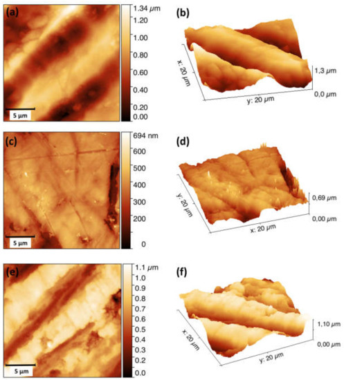 Representative 2D and 3D AFM topographies of (a,b) NiTi_Vis Plus, (c,d) NiTi_Azdent, (e,f) β-Ti_Ormco.