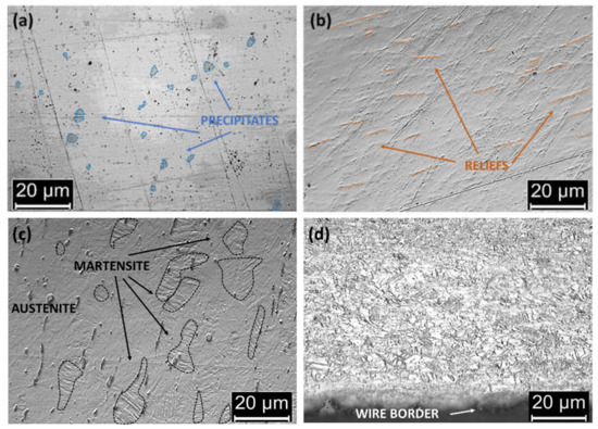 Both of the two polished NiTi surfaces have coarse precipitates unevenly distributed (highlighted with blue dashed circles in Figure 5a), indicating that they have been through a thermal treatment, probably ~500 °C, in “shape setting” into the U shape. The polished β-Ti_Ormco surface presented reliefs (Figure 5b). After etching, both NiTi showed martensite lamellae with the needle-like morphology (black dashed circles), amongst the smooth austenite (Figure 5c); β-Ti_Azdent showed small grains near wire border, whose composition needs further analysis (Figure 5d).