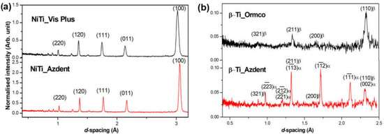 Neutron diffraction data were analyzed with GSAS (General Structure Analysis System) software [35] for the refinement of structural models to powder diffraction data with the EXPGUI interface [36], using the Rietveld method to determine phase weight fraction (Figure 6). Both NiTi products are fully austenite at room temperature (Table 3). β-Ti_Ormco contains only body-centered cubic β phase, while β-Ti_Azdent unexpectedly contains ~41.2 wt.% of close-packed hexagonal α phase besides the expected β phase. This is a direct result of the significantly lower fraction of the β-stabilizing element Mo. The peak broadening present at nearly all peaks in the diffraction spectra is a manifestation of preferred orientation, which is almost always present in metal wires due to the manufacturing process [17].