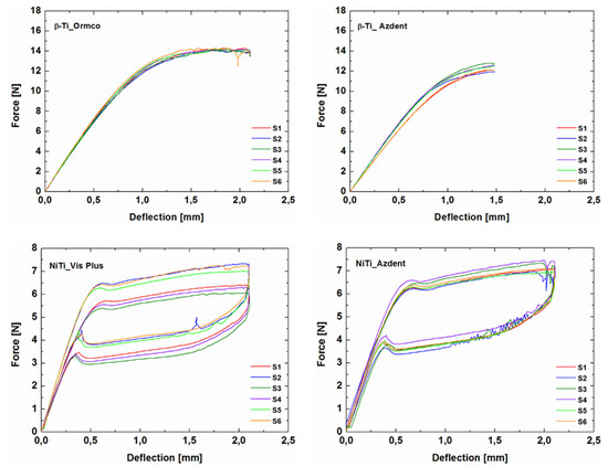 The results of three-point bending tests are reported on the same scale in Figure 7 and the determined parameters are tabulated in Table 6 and Table 7. It was observed that the β-Ti products exhibited similar mechanical responses with no significant differences in either FS(0,1) or E; however, FΔs were significantly different. E is within the determined range for unaged alloy. Thus, it could be inferred that both products are unaged. NiTi products exerted very similar unloading forces and E.