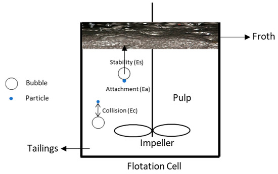 Bubble–particle interactions are widely acknowledged to be the most important sub-process in froth flotation. These interactions can be quantified based on statistical approaches on successful transfer of particles on bubbles towards the froth phase and then concentrates. These interactions were categorized into collision (), attachment (), and stability () sub-processes [5]. A clear understanding of these sub-processes is basically essential in the estimation of flotation kinetic rates. Figure 1 shows a schematic overview of the sub-processes , , and involved in the overall process of froth flotation [6], and their details will be described in Section 2.