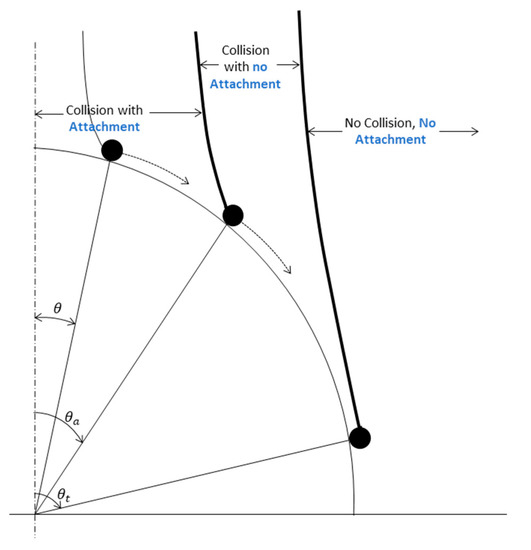The Dobby–Finch attachment model [45] was used to calculate the attachment efficiency, which is defined as the ratio of the area corresponding to an angle (adhesion angle) to the area corresponding to (maximum collision angle, Figure 2). The basic equation for this model is mathematically expressed as Equation (7).