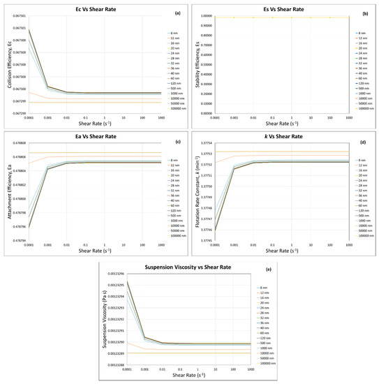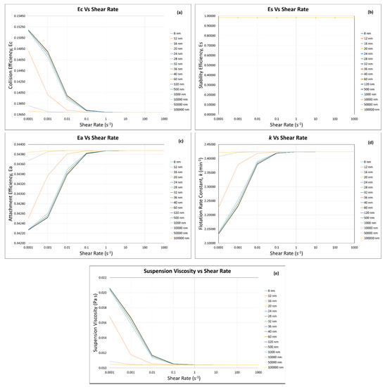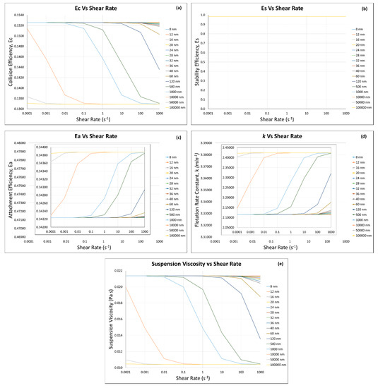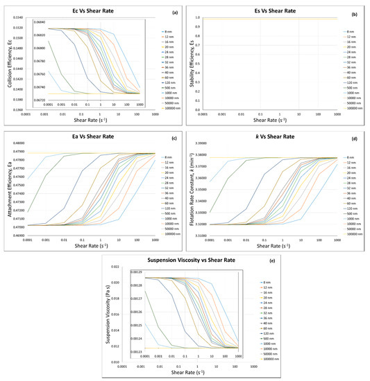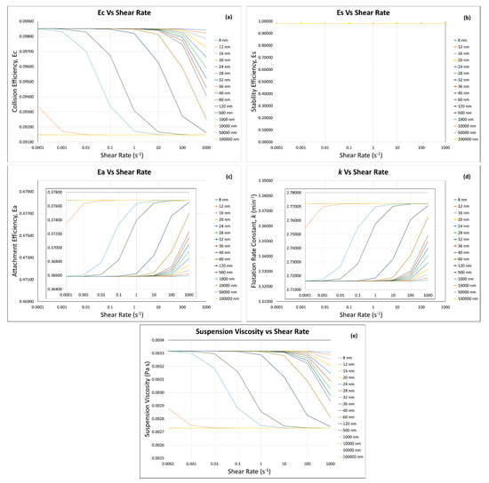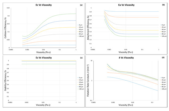 Suspension viscosity was varied between 0.0005 and 1 Pa s, and the flotation efficiencies and rate constant were calculated by using the flotation kinetics model introduced in Section 2 as a function of particle diameter (8–100 µm). The results shown in Figure 3a indicate that the increase in viscosity increases the collision efficiency with the greater particle diameter. The increase in suspension viscosity decreases the Stokes number (Equation (6)), which in turn increases the maximum collision angle () (Equation (4)). As shown in Figure 2, a higher means a higher collision probability between particle and bubble. With the increase in particle size, the probability of collision between bubble and particle increases (as explained by the Sutherlands [51] (Equation (2)), and thus the collision efficiency increases with the increase in particle diameter.