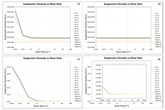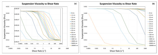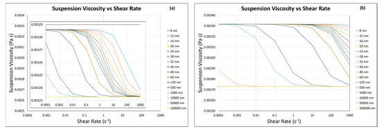 At low particle concentrations, the viscosity of hard sphere suspensions (Equation (20)) is independent of shear rate (). At higher concentrations, the viscosity exhibits a typical three-stage dependence with shear rate: (1) at low shear rates, they show Newtonian behavior, with a constant zero-shear viscosity ; (2) at intermediate shear rates, the viscosity decreases following a shear-thinning behavior (a phenomenon characteristic of some non-Newtonian fluids in which the fluid viscosity decreases with increasing shear stress); and (3) at high shear rates, the viscosity attains a limiting and constant value, the infinite-shear viscosity . The decrease in viscosity at increasing shear rates is either due to the alignment of suspended particles in the direction of flow or to the shear thinning behavior of the suspending liquid (the continuous phase) [65].