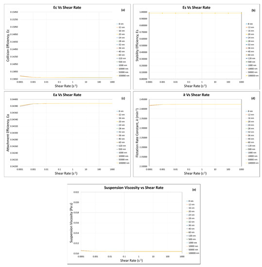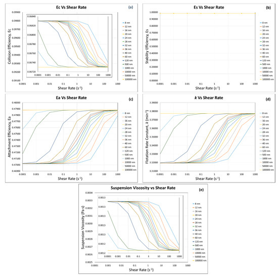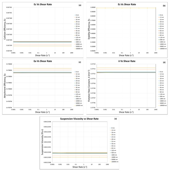 This section is composed of two parts. The Section 3.1 and Section 3.2 will first illustrate and discuss the effect of particle size and suspension viscosity on the flotation efficiencies and rate constant of the particle size range between 8 and 100 µm based on the previously proposed equations. The Section 3.3 and Section 3.4 will then show and discuss the suspension viscosity calculated by viscosity model equations and their integration to the flotation efficiencies and rate constant model that are now able to calculate and investigate the effect of the solid concentration/fraction and shear rate on flotation efficiencies and rate constant of selected flotation particle size of 80 µm. Literature values summarized in Table 1 were used to compare with our calculated values. The suspension viscosity calculation results presented in this section were made on quartz particle suspensions, using the liquid viscosity of water at 25 °C as 0.00091 Pa s [78], suspension pH as 10, and salt concentration and type as 1 × 10−2 M KNO3, respectively. pH 10 is a typical pH for quartz flotation [79]. The zeta potential value of quartz particle was extracted from our previous report [80]. After our preliminary calculations (Appendix A Figure A1, presented in Section 3.1), the flotation efficiencies and rate constant were calculated using the calculated suspension viscosity and for the following conditions: turbulence dissipation energy m2 s−3, gas flow rate as 0.0035 m3 min−1, bubble diameter as 0.0014 m, volume of cell as 0.00225 m3, quartz particle density as 2650 kg/m3, bubble velocity as 0.18 m s−1, liquid–vapor surface tension as 72.8 m Nm−1, particle contact angle as 80°, and flotation particle diameter as 80 μm [5].