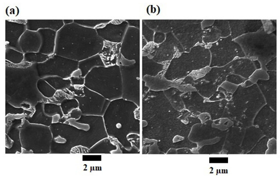 Figure 1a,b show the SEM microstructure of as-received API 5L steel in two different regions containing the polygonal/semi-polygonal ferrite with a small fraction of degenerated pearlite, mainly at the boundaries, which commonly develops during hot-rolling of low carbon-low alloy steels. Degenerated pearlite is considered as non-lamellar pearlite due to the lack of carbon and micro-segregation element alloys in hypo-eutectoid steels [22]. The presence of a small fraction of pearlite could be explained by the interdendritic microsegregation, such as manganese in the prior austenite grains. The fine ferritic structure of about 5.5 ± 0.5 µm was exhibited in the investigated steel due to the presence of microalloying elements such as Ti, followed the thermomechanical processing [23]. The role of grain size on hardness and mechanical properties is well-understood by the Hall-Petch equation. Grain boundaries and ferrite-cementite interface act as barriers against dislocation gliding, thereby increase the resolved shear stress of plastic deformation. Hardness value was estimated with the approximate amount of 354 ± 14 HV0.5 in this steel.
