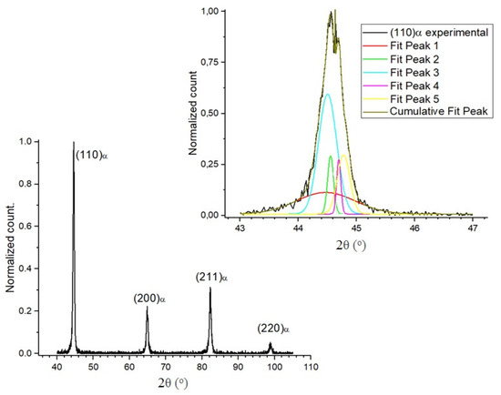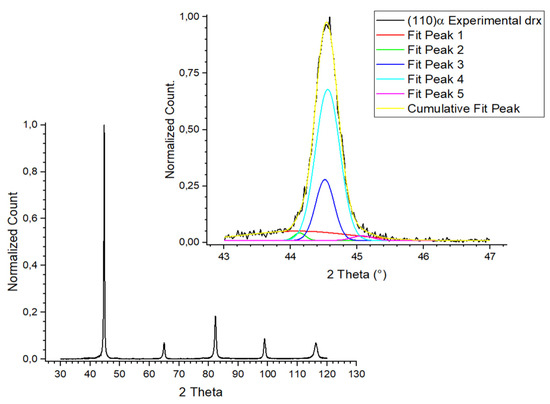 The XRD patterns of the investigated specimen are shown in Figure 2. The XRD spectrum shows the presence of a fully body-centered cube (BCC) ferritic structure with no carbide content due to the accuracy of the experimental conventional XRD diffraction methods. Luo et al. [25] introduced multiple Gaussian peak-fitting methods to calculate the atomic configuration in medium carbon steel. The (110)α spectrum peak with the highest penetration level was separated into five overlapping diffraction peaks using the self-made numerical process of Gaussian multiple peaks to estimate the peak position, integrated intensity, and peak broadening (full-width at half-maximum). These distinct five sub-peaks (adj R2 = 0.999886) variations are listed in Table 1 to calculate dislocation density due to the carbon segregation to dislocations during thermomechanical processing and the effect of microsegregation and precipitation at the ferritic matrix. Carbon and alloying element segregation increased the dislocation density to develop cellular dislocation structure, which gradually increased by increasing the level of straining during thermomechanical processing. Such gradual increase of dislocation density can be detected by peak broadening analysis suggested by the Debye-Scherrer method [26]. XRD analyses combined with multiple Gaussian peak-fitting methods estimated the average lattice strain and dislocation density was 1.068 × 10−3 and 2.90 × 1013 m−2, respectively. Such a low dislocation density could be related to the full or partial dynamic recrystallization and recovery during thermomechanical processing.