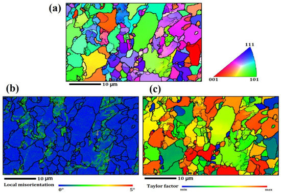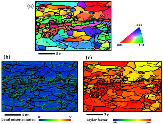 Figure 4a shows the normal direction orientation image mapping showing the crystallographic orientation of each grain with point-to-point misorientation greater than 15°. Hence, a random orientation texture is identified in this region and a slight fraction of (110) and (112) grains parallel to the rolling plane is shown in this figure. It is clear that (110) and (112) planes are considered as the principal close-packed planes in BCC structure and are activated at higher temperatures during thermomechanical processing. A low fraction of medium-angle boundaries (5° < θ < 15°) also proves that dynamic recrystallization would effectively occur, resulting in a low distorted structure. As shown in Figure 4b, Kernel average misorientation (KAM) analysis shows the local plastic strain due to the localized crystallographic orientation distortion. Grain boundaries associated with (110) and (111) planes revealed the highest lattice distortion, rarely exceeding 3.0°. Such lattice distortion and crystallographic defects could generate and accumulate stored energy to nucleate micro-cracks or provide adequate resolved shear to pass dislocation into the neighboring grain. Taylor model based on three different slip systems (i.e., {110}<111>, {112}<111>, and {123}<111>) was simulated according to the uniaxial tension loading matrix to predict the behavior of each grain. At least five independent activated slip systems are required for commencing the plastic deformation. Soft grains with blue color in Figure 4c indicate that these grains already provide sufficient slip systems, while hard grains with red color are restricted to any further rotation for further necessary slip systems. Therefore, the nucleation of micro-cracks is probable in these boundaries and these micro-cracks can propagate in intergranular or transgranular manner due to the lattice distortion and stored energy of the individual grains.