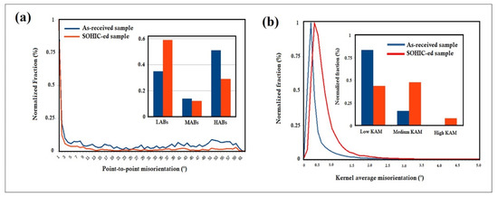 Comparison of (a) point-to-point misorientation and (b) Kernel average misorientation data of the EBSD data before and after the SOHIC test.