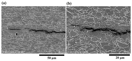 Figure 8a,b show SEM images of two SOHIC cracks with two different magnifications observed at the mid-thickness of the cross section appeared after electrochemical hydrogen charging. Such cracks nucleated from the non-metallic inclusions due to the hydrogen buildup pressure and propagated through the hard phases or grain boundaries [32,33,34]. Moreover, when the crack is formed, hydrogen atoms are accumulated in the crack tip and crack tip acts as a void. Hydrogen buildup pressure at the crack tip is considered a driving force for the crack propagation.