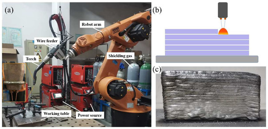 Al-Cu alloys are widely applied in aerospace industries due to their high specific strength and excellent processing properties [1,2]. However, traditional manufacturing processes, such as casting or forging, not only have long processing cycles, but also have low material utilization rates to manufacture Al-Cu alloy components. Wire + arc additive manufacturing (WAAM), a rapid near net-shape method, adopts arc as the heat source, melting and depositing the filler wires along the designed path to manufacture large structural components, which has attracted attention of many researchers [3,4,5]. WAAM is extremely suitable for rapidly manufacturing medium and large metallic structures with advantages in high depositing efficiency, low cost of equipment, and flexibility of materials and design [6,7,8].