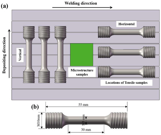 Experimental specimens were obtained from the middle part of the alloy, which is shown in Figure 2a. The welding direction was defined as the horizontal direction, while the depositing direction was defined as the vertical direction. The tensile tests were performed by the universal tensile testing machine with a tensile rate of 2 mm/min. The rod-shaped tensile specimen size is shown in Figure 2b. The Vickers micro-hardness starting at 40 mm from the bottom in units of 0.5 mm was examined along the Z-axis direction with 200 g load for 15 s.