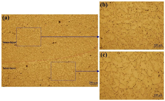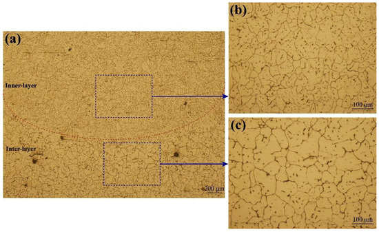 Figure 5a shows the metallographic structure of the YOZ section of the as-deposited alloy. The microstructure was divided into the inter-layer region and inner-layer region by the fusion line, and the microstructure in the different regions was similar to those of the XOZ section. The average grain sizes were about 49 μm in the inner-layer region (Figure 5b) and about 64 μm in the inter-layer region (Figure 5c).