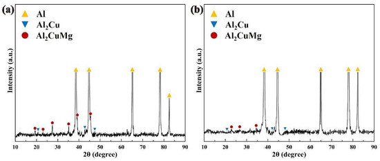According to the Al-Cu-Mg ternary phase diagram, the ternary eutectic reaction occurs at 507 °C: L → α(Al) + S-phase (Al2CuMg) + θ-phase (Al2Cu) during the solidification of aluminum alloy. Figure 7 shows the XRD results of as-deposited and T6 heat-treated alloys. It can be found that the as-deposited and T6 heat-treated alloys are mainly composed of α(Al), θ-phase (Al2Cu), and S-phase (Al2CuMg). The results are consistent with the phase diagram.