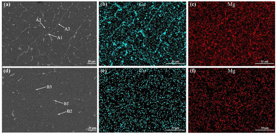 After T6 heat treatment, most of the eutectic structures distributed continuously along the grain boundaries were dissolved into the α(Al) matrix, as shown in Figure 8d. The results of EDS point scanning and map scanning of elements demonstrate that the undissolved second phases were θ-phase (Al2Cu) and S-phase (Al2CuMg), and the distributions of Cu and Mg elements became homogeneous, as shown in Figure 8e,f.