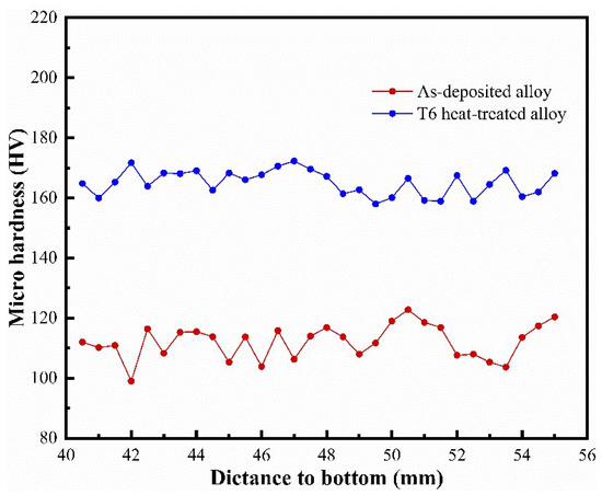 Figure 9 shows the micro-hardness of the middle region of as-deposited and T6 heat-treated alloys. The average micro-hardness of the as-deposited alloy was 112 HV0.2, and the micro-hardness value fluctuates significantly due to the uneven distribution of Cu and Mg elements. After T6 heat treatment, the average micro-hardness was 165 HV0.2, which increased by 47.3% than that of as-deposited alloy. The micro-hardness value fluctuates in the range of 158 to 172 HV0.2, and the distribution was relatively uniform, which was related to the uniform distribution of Cu and Mg elements after the T6 heat treatment.