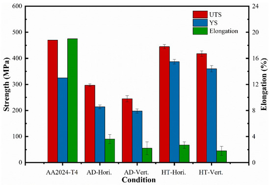 Figure 10 shows the tensile properties of as-deposited and T6 heat-treated alloys in both horizontal and vertical directions. The UTS, YS, and elongation of the as-deposited alloy were 297 MPa, 214 MPa, and 3.6% in the horizontal direction, and 245 MPa, 198 MPa, and 2.2% in the vertical direction, respectively. After the T6 heat treatment, the UTS, YS, and elongation were 445 MPa, 387 MPa, and 2.7% in the horizontal direction, and 418 MPa, 360 MPa, and 1.8% in the vertical direction, respectively. The strengths of WAAM Al-4.7Cu-2Mg alloy after the T6 heat treatment are close to the traditional 2024-T4 plate, while the elongation is lower. It can be found that the strength and ductility of both as-deposited and T6 heat-treated alloys in the vertical direction were significantly lower than those in the horizontal direction, which was related to the existence of obvious pores and the oxide of aluminum distributed in the inter-layer region. After the T6 heat treatment, the solid solution strengthening of alloy elements and the precipitation strengthening of the secondary phases significantly improved the strengths of the alloy. However, the ductility was further reduced due to more severe pores and hole defects.